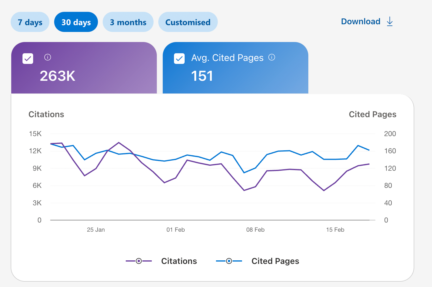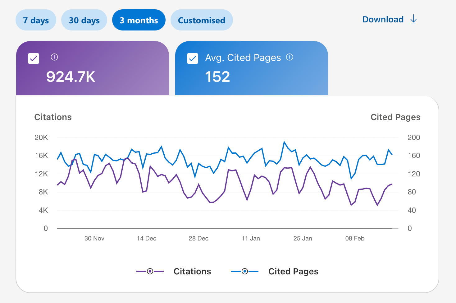 The average cited pages per day stayed nearly identical across both windows. That consistency shows the strategy was producing stable, compounding visibility rather than a short-term spike.
