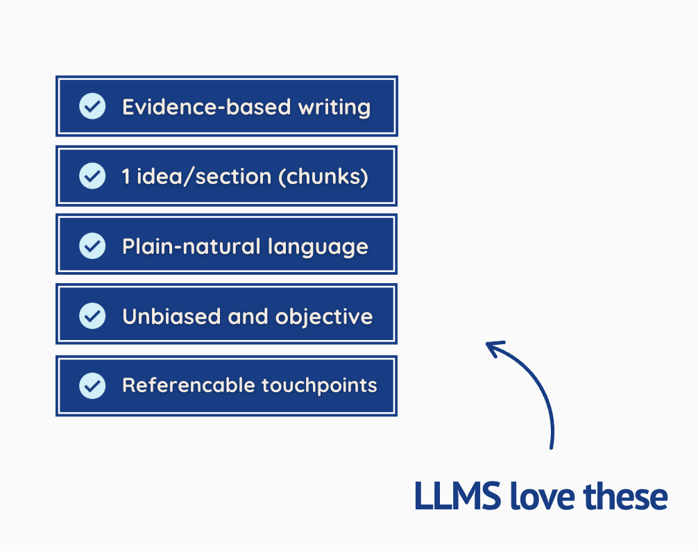 - Evidence-based writing: the solid info/evidence people and LLMs want to see in content. Take product listicles, for example. This included things like pros, cons, pricing, reviews, product usage insights, etc.