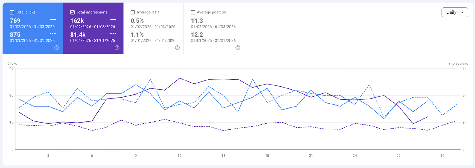This growth reflects a key SEO principle. Visibility expands before traffic fully catches up. As more pages rank for more queries, impressions rise first. Clicks follow as rankings strengthen and intent alignment improves.