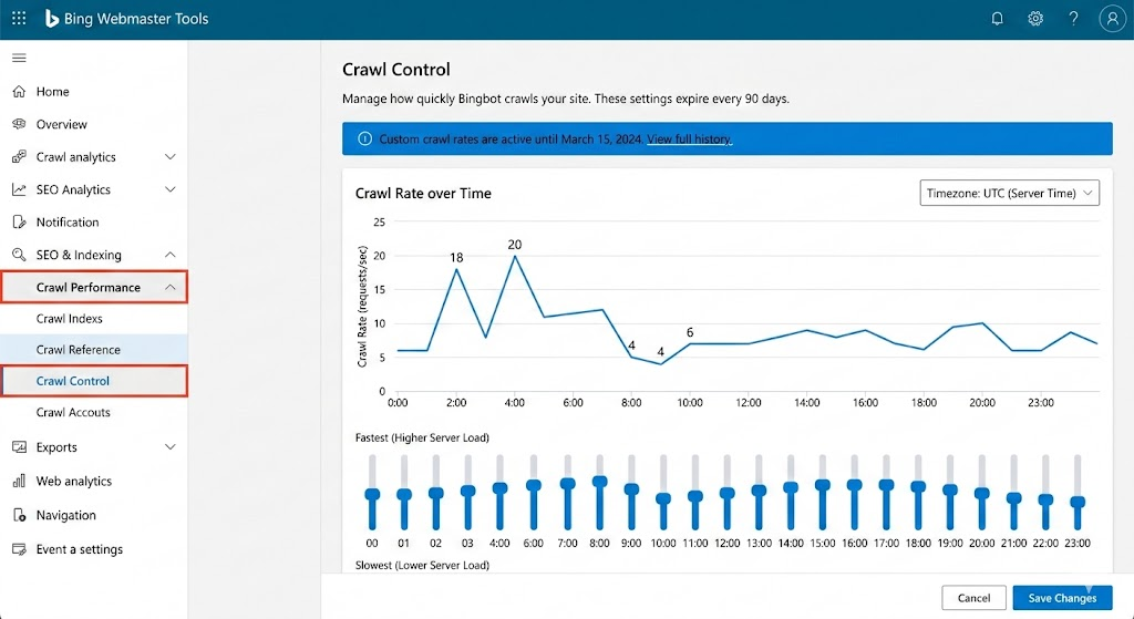 Think of it like a volume dial for Bingbot. Turn it up, and Bing crawls your site more aggressively. Turn it down, and you give your server more breathing room. You can also schedule those settings so that Bingbot crawls more during quiet hours (overnight) and backs off during your peak traffic periods.