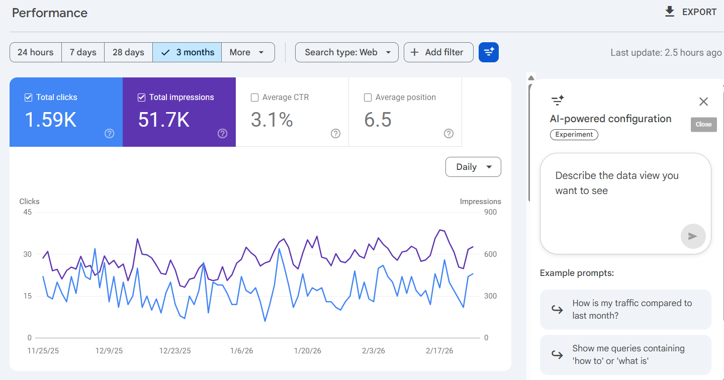 Search Console now supports conversational filtering, letting you type natural language queries like "show me product pages with declining CTR" instead of manually configuring filters. It's a meaningful UX upgrade, but it's still not the same as a dedicated report showing how your content performs inside AI-generated responses.
