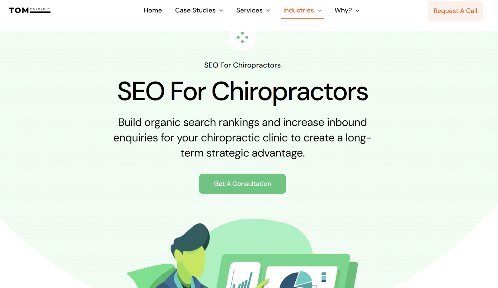 Tom McSherry, with 15 years of SEO expertise, leads an SEO agency serving professional service industries, including the healthcare industry. For chiropractors, their solution helps practices grow through targeted organic search strategies, addressing both informational and transactional queries.