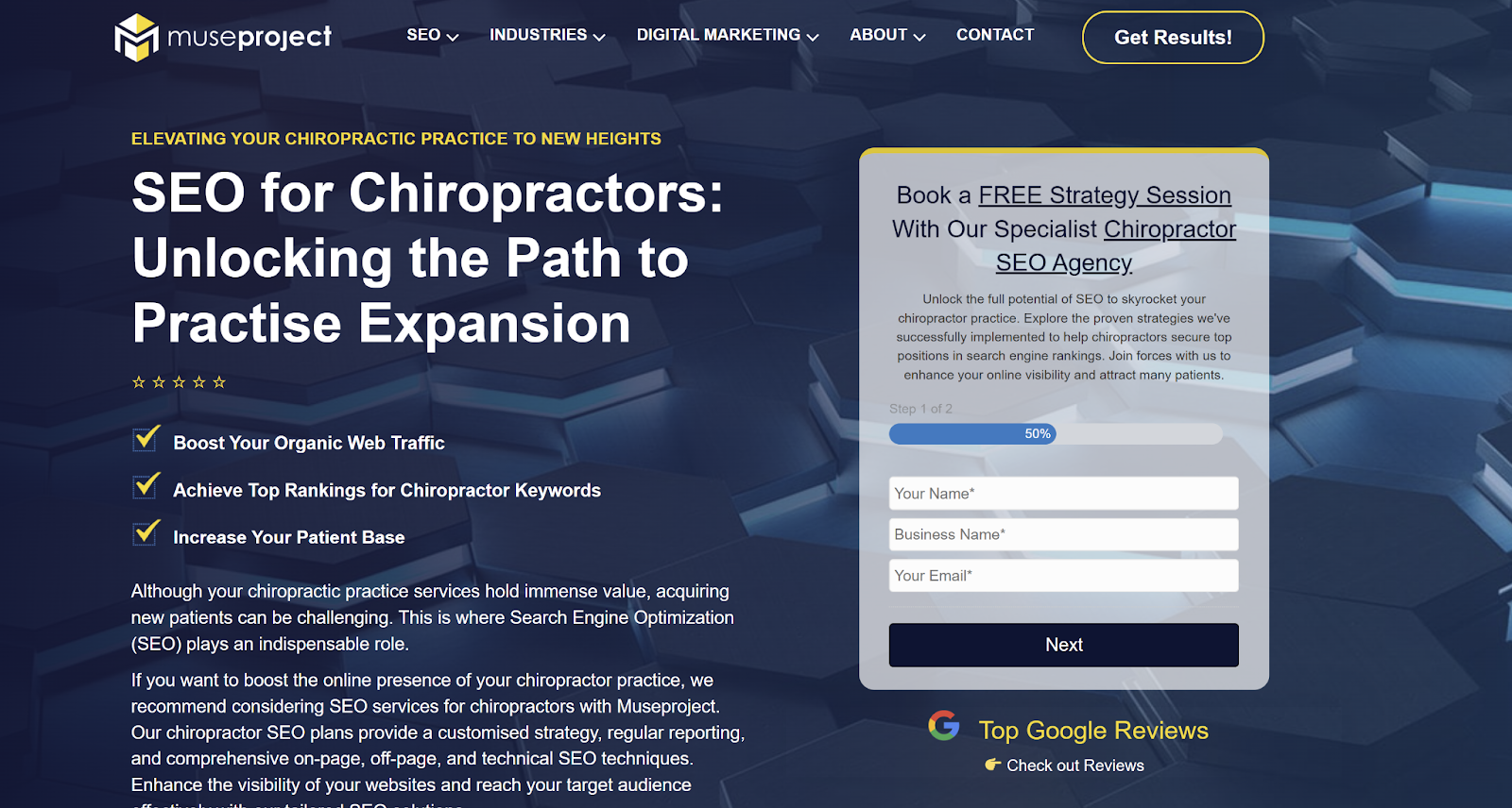 Museproject is a full-service SEO agency that helps professional service providers like chiropractors increase their online visibility and attract more patients through targeted SEO strategies. They specialize in customizing SEO plans tailored to chiropractic practices, focusing on both local SEO and technical SEO to ensure high rankings in competitive markets.