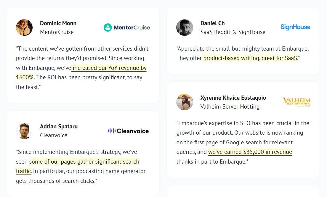 Move beyond content-only vendors. Your partner should optimize your entire search presence, not just produce articles. At Embarque, our 27+ verified case studies across programmatic, technical, and link-building demonstrate integrated growth across all SEO disciplines.
