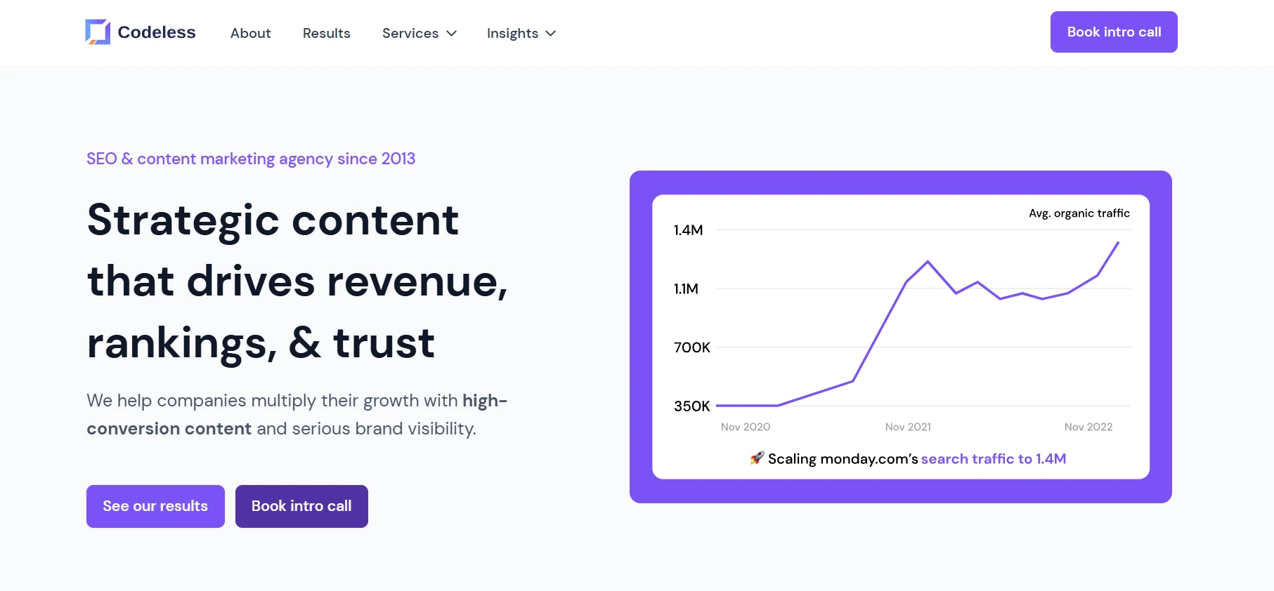 Codeless excels at producing hundreds of long-form articles per month, boosting blog traffic for brands like Monday.com. However, their approach prioritizes output over full-funnel performance, leaving gaps in technical SEO, programmatic optimization, and content types beyond blogs.