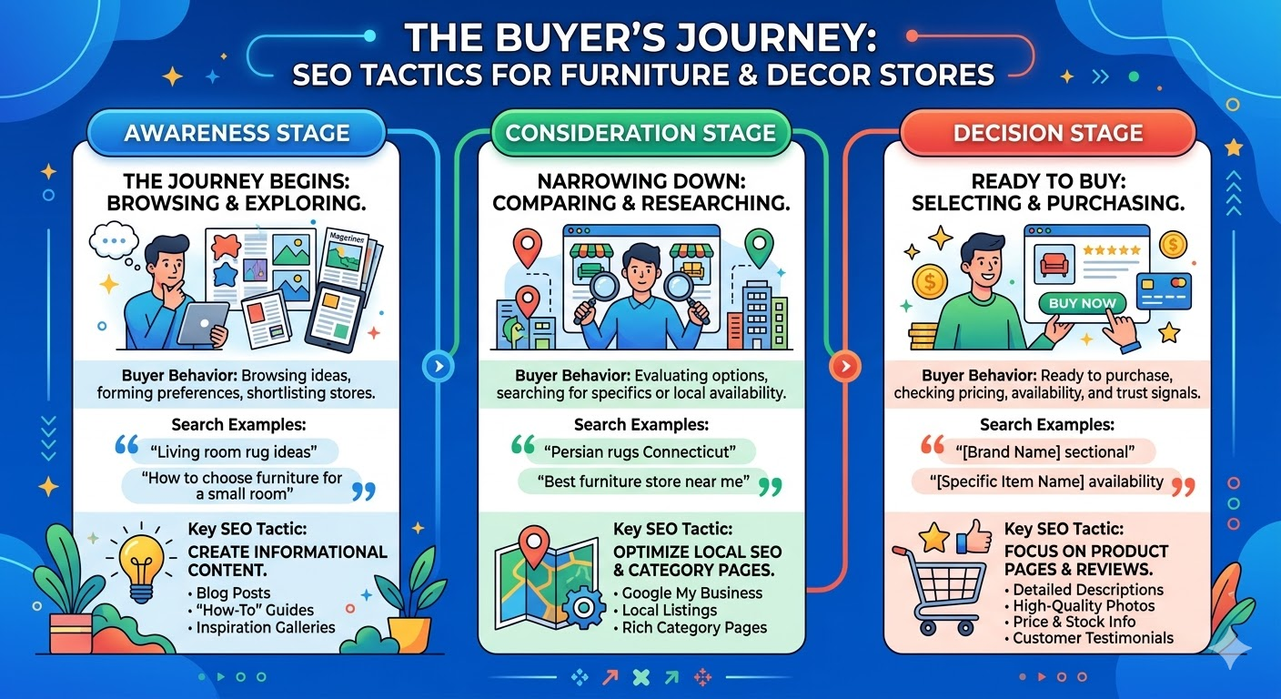 - Awareness: The buyer is browsing. They search things like "living room rug ideas" or "how to choose furniture for a small room." They are forming preferences and shortlisting stores. Informational content does the work here.