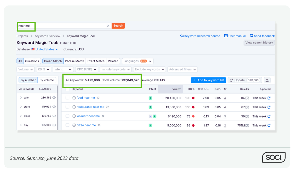 Semrush data shows over 800 million monthly searches containing some "near me" variation in the US. The opportunity rewards stores that invest in location pages and Google Business Profile optimization.