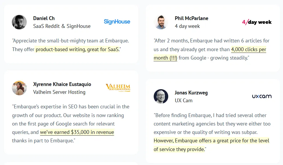 Look for agencies with a track record of delivering measurable results for SaaS or tech companies. At Embarque, we’ve helped companies like Instatus and SignHouse achieve multi-thousand percent traffic growth while driving qualified leads.