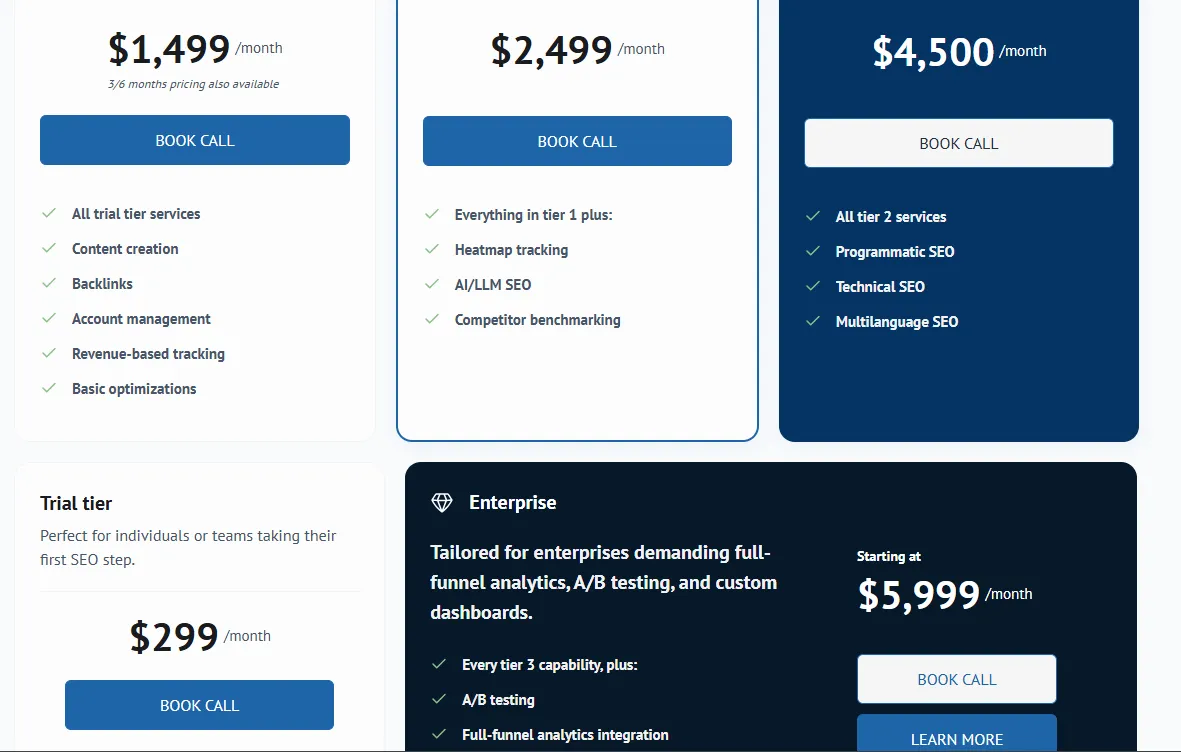 - Our growth-focused SEO plans start at $299 per month for the Trial tier with basic SEO optimizations, scaling to $1,499 for managed SEO with content and backlinks.