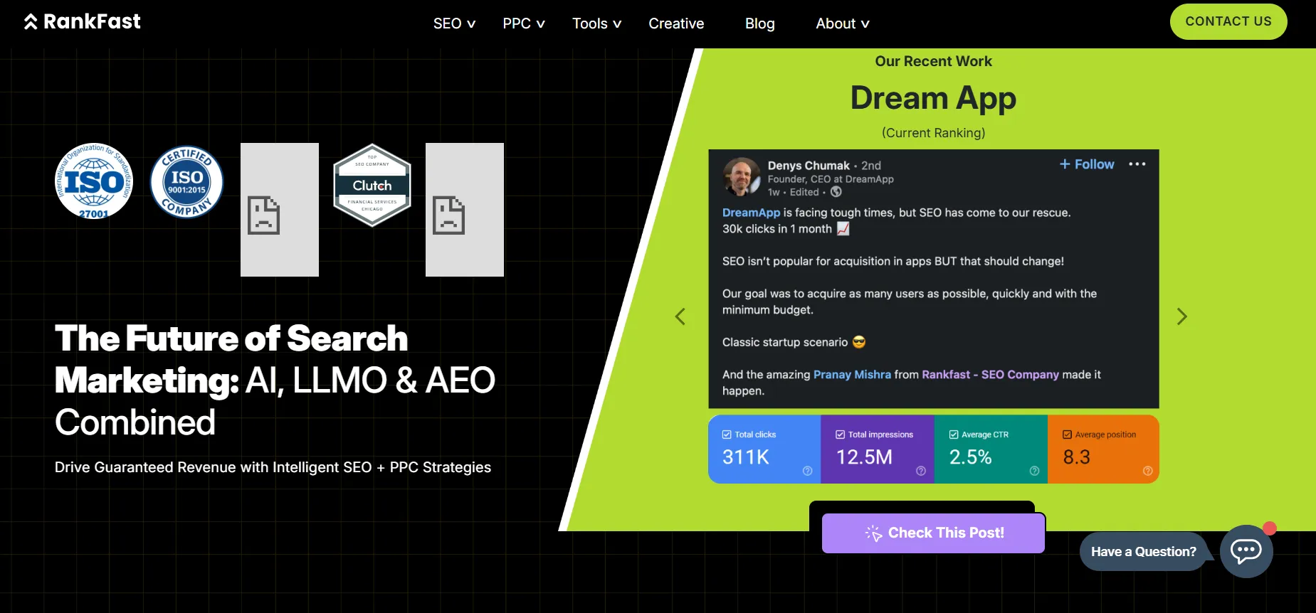 RankFast is a faster and more affordable SEO alternative to MADX Digital, designed for businesses seeking rapid organic growth. Known for its “fast-scaling” strategies and aggressive keyword expansion, RankFast delivers quick results without breaking the bank. With flexible pricing and lower minimum commitments, it’s the go-to choice for brands chasing cost-efficient, high-speed traffic gains.