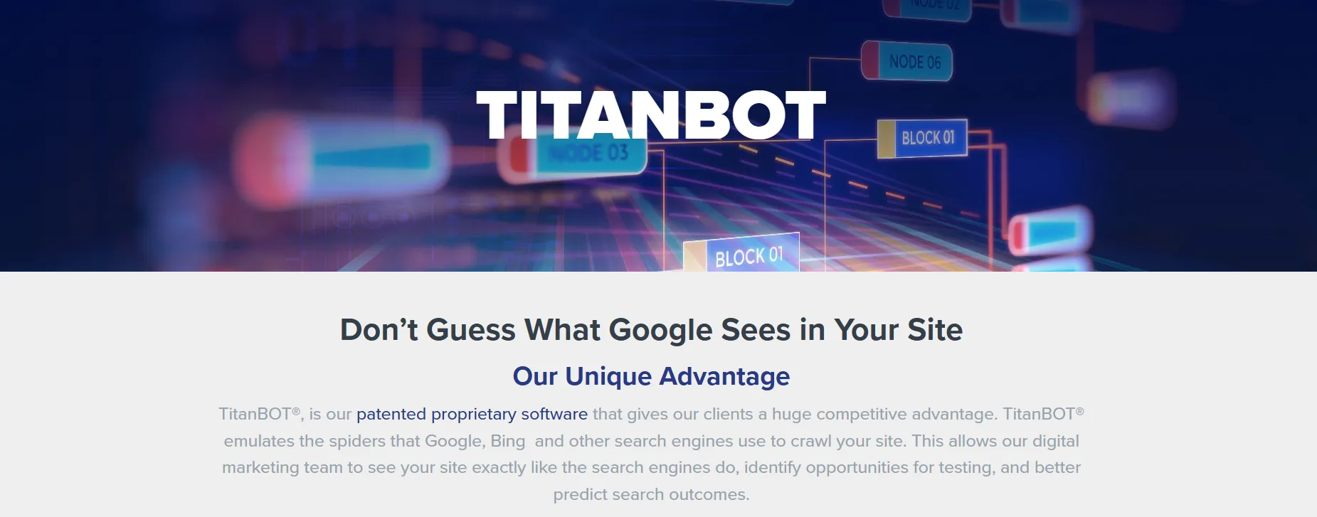 Their in-house team of Google-certified experts leverages TitanBOT®, a patented search engine spider that predicts how sites will perform on search engines.