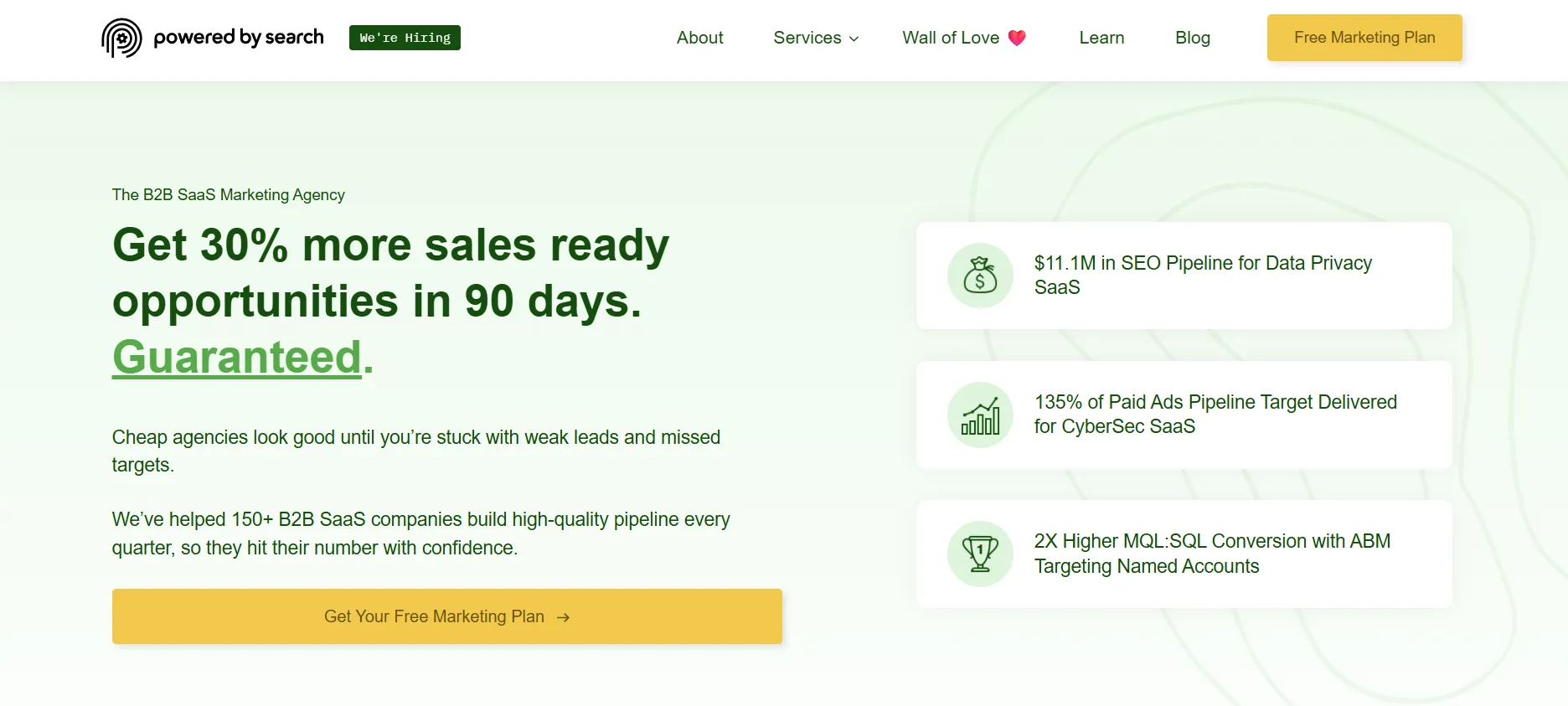 For B2B SaaS companies chasing measurable growth, few do it better than Powered by Search, a sharp alternative to Titan Growth. Their “Traffic-to-ARR Pipeline” model transforms SEO from a visibility play into a true revenue driver. Every strategy is tied to pipeline, ARR, and sales outcomes, ensuring growth that’s both trackable and predictable.