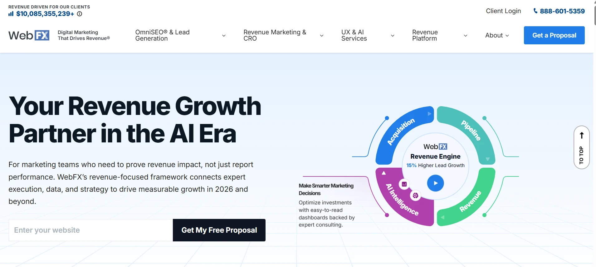 WebFX is a full-service digital marketing agency with nearly three decades of experience. They combine SEO, paid media, content marketing, web design, and proprietary technology to drive client growth, reporting over $10 billion in revenue and millions of leads for clients across industries.