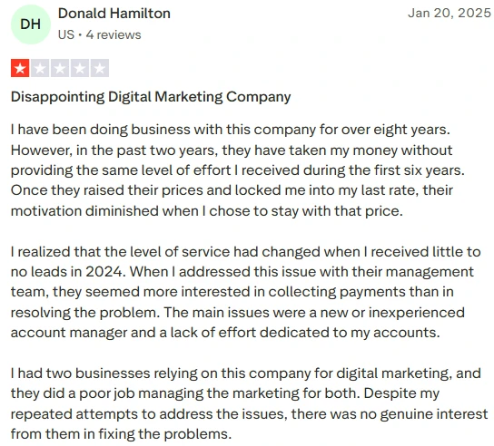 - Inconsistent service quality: Multiple client reviews highlight strong results during the initial engagement, but performance often declines after contract renewals or staff changes.