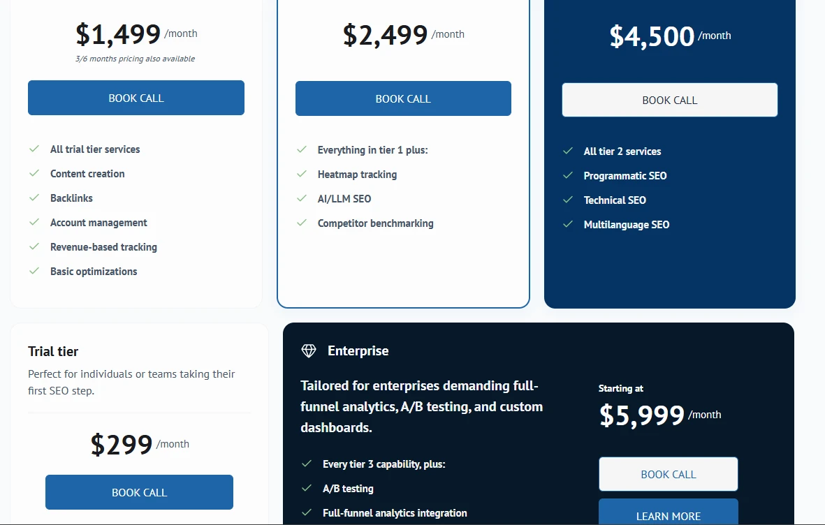 Broad custom pricing can create ambiguity and make budgeting more difficult. Clear pricing helps with cost planning and ROI forecasting. Look for agencies that publish standard packages or clear pricing tiers so you know what to expect each month.