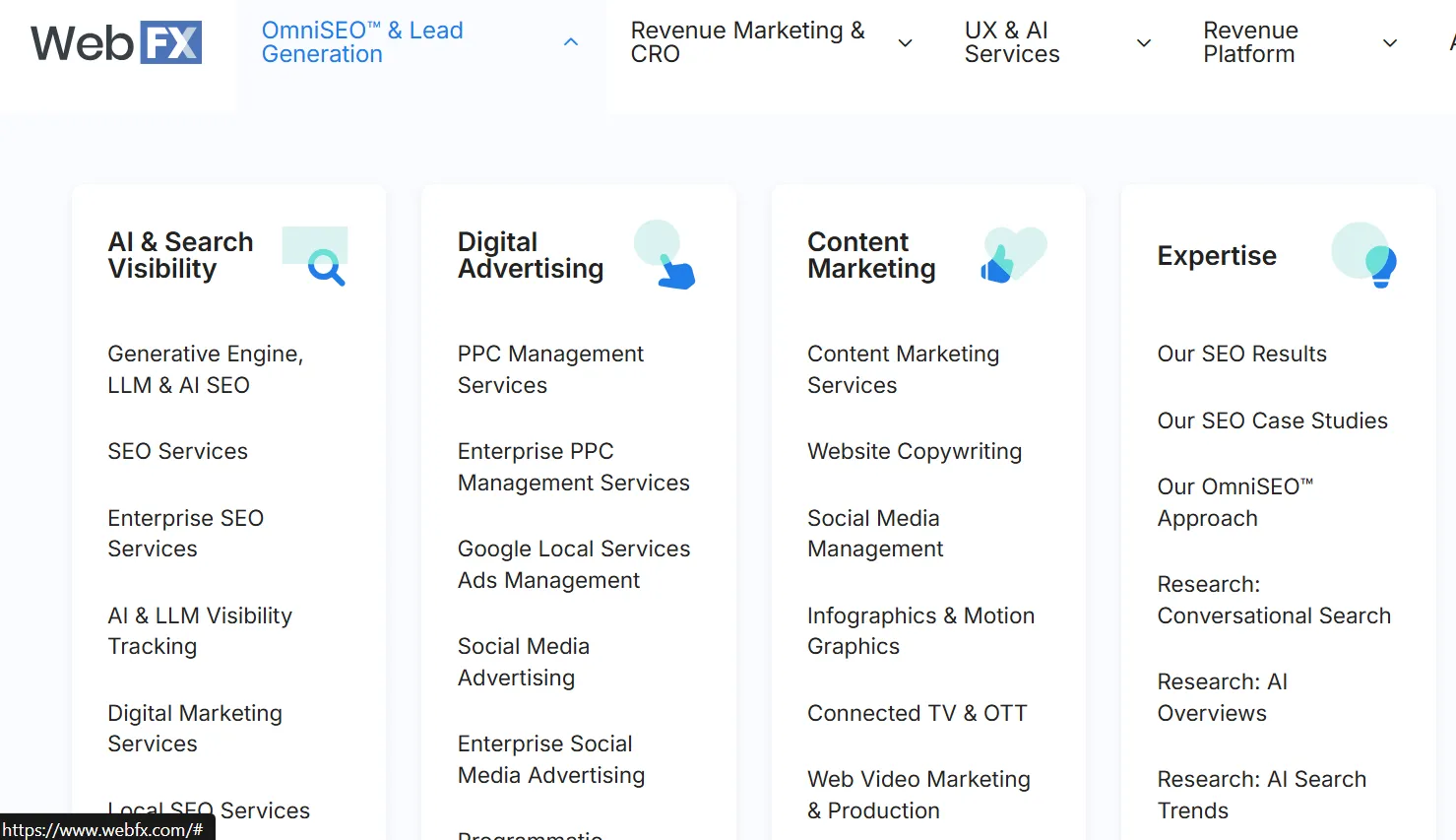 WebFX positions itself as a full-service digital marketing agency, offering a broad range of solutions designed to function as a one-stop shop for businesses. From foundational SEO to advanced digital strategies, their services allow clients to streamline multiple aspects of their online presence under a single provider.