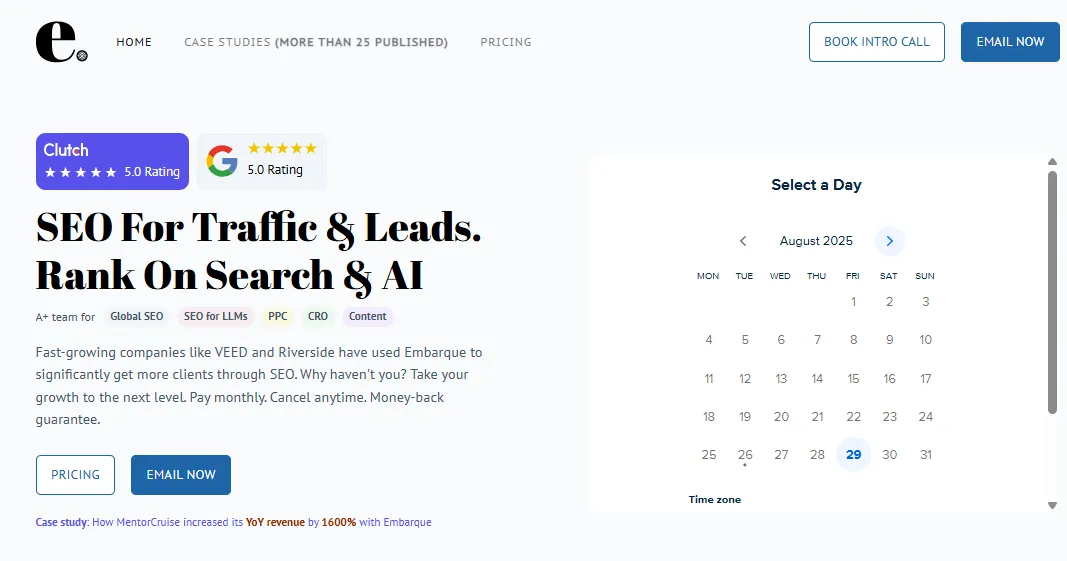 That’s where Embarque stands apart. By focusing exclusively on SaaS, tech, and high-growth companies, we bring deep specialization, complete pricing transparency, and future-proof strategies like AI-driven and programmatic SEO. Instead of long contracts and high retainers, we provide flexible, ROI-driven partnerships designed to deliver both quick wins and sustainable growth.