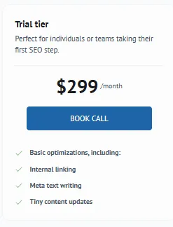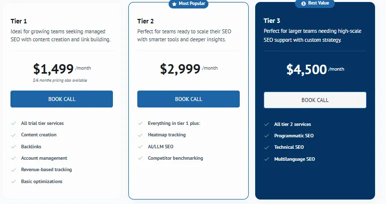- One-off projects: Website redesigns, technical SEO audits, and other standalone services are priced separately. For example, a custom website design project generally starts at $8,000, with costs varying based on features, integrations, and overall scope.