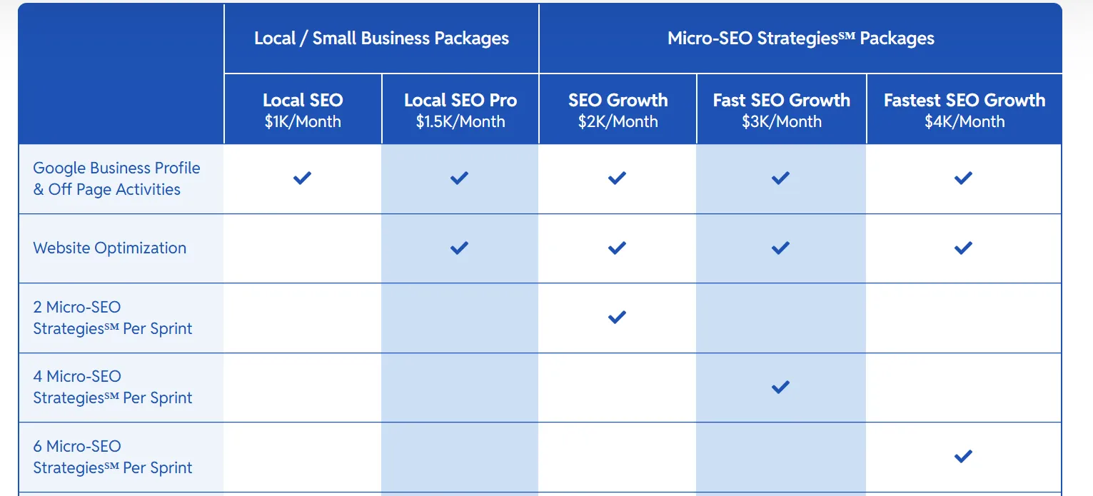 - Micro-SEO Strategies℠ Packages: Start at $2K/month with 2 strategies per sprint, scaling up for Website Optimization plus 6 strategies per sprint.